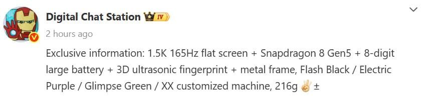 The device is said to feature a 6.7-inch OLED display with a 1.5K resolution and a 165Hz refresh rate, targeting smooth visuals for gaming and media. Tipped to weigh 216 grams, the phone may arrive in Fresh Black, Electric Purple, Shadow Green, and a special edition colorway.